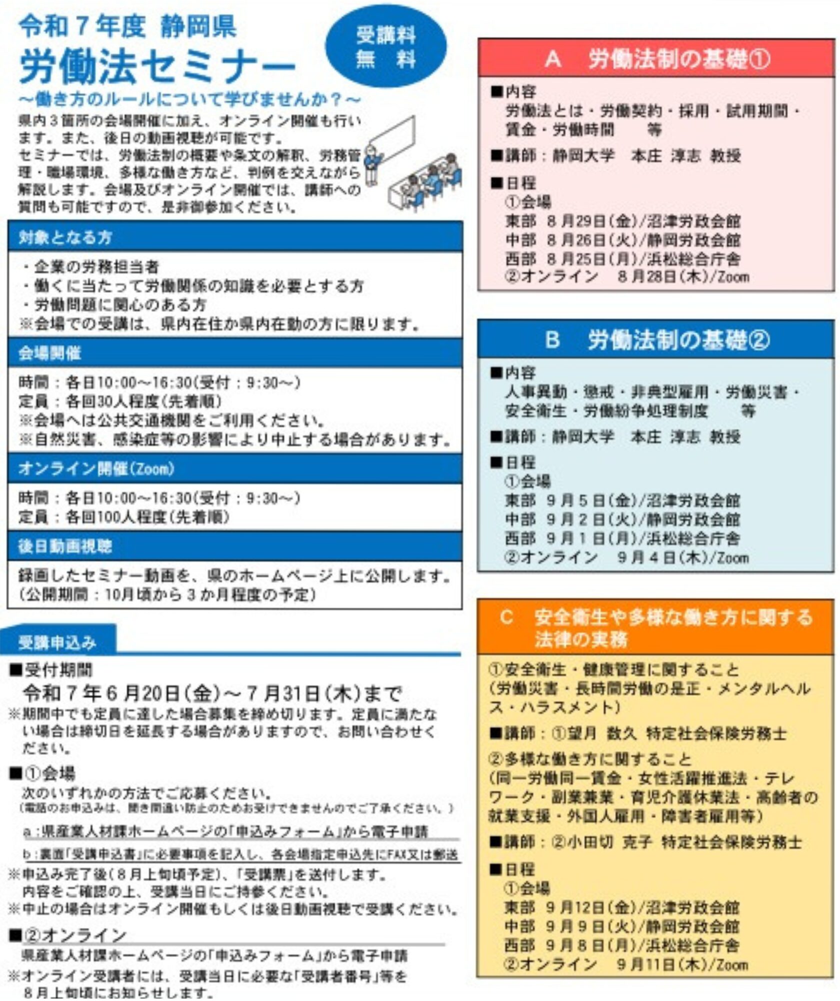令和7(2025)年8月25日(月)から9月12日(金)まで、静岡県主催の「令和7年度 静岡県労働法セミナー」が開催されました。